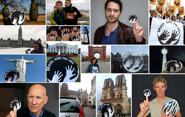 Dutzende Stars und Hunderte Menschen aus 38 Ländern schwenkten Survivals Awá-Symbol zur Unterstützung des bedrohten Volkes. Bild: © Survival