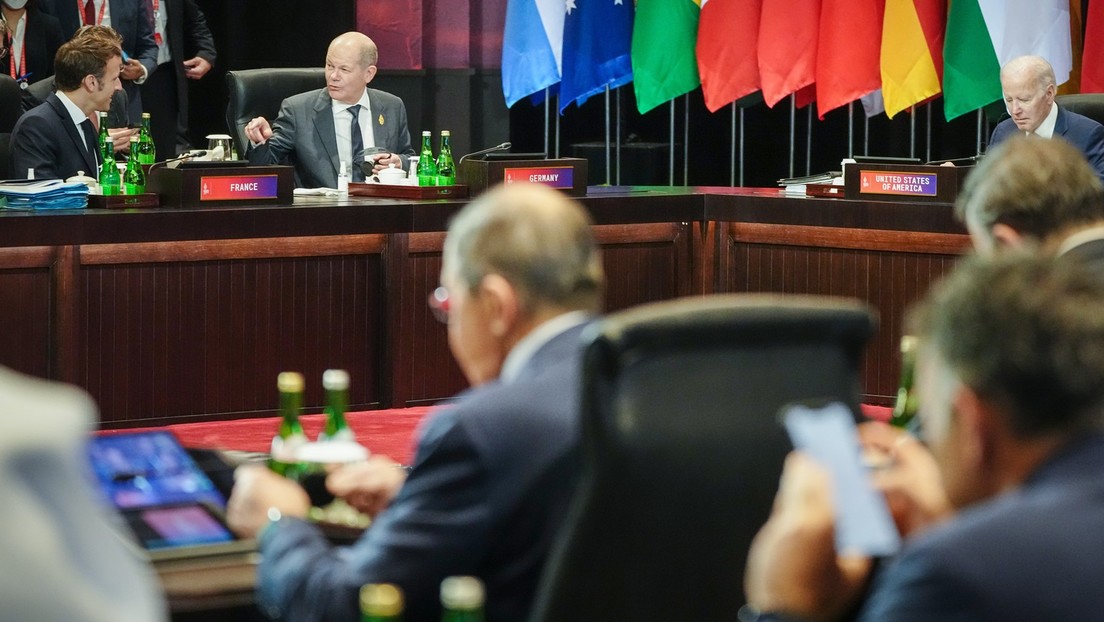 Russlands Gesandter Sergei Lawrow (vorne) und Emmanuel Macron, Olaf Scholz und Joe Biden auf dem G20-Gipfel in Indonesien am 15. November