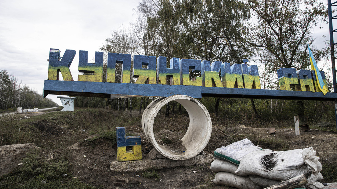 Mit ukrainischen Nationalfarben übermalte Stele an der Einfahrt nach Kupjansk (Symbolbild) Bild: Gettyimages.ru / Anadolu Agency