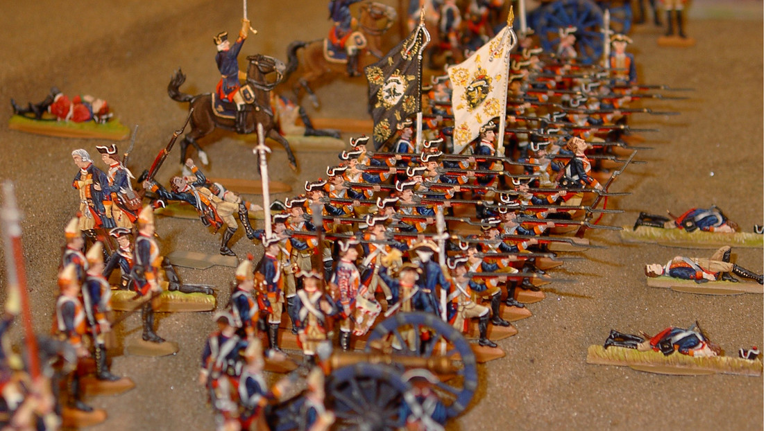 Sandkastenspiel mit Flachzinnfiguren eines Abschnittes der im Jahre 1757 geschlagenen Schlacht von Kunersdorf, heute Kunowice in der polnischen Woiwodschaft Lebus
