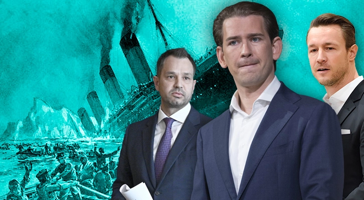 Bild: Titanic/gemeinfrei; Schmid/HANS PUNZ, APA; Kurz/Tobias Steinmaurer, beide via picturedesk.com; Blümel/Parlamentsdirektion/Zinner; Bildkomposition "Wochenblick" / Eigenes Werk