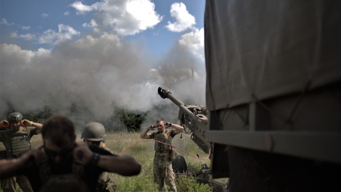 Ukrainische Soldaten schützen ihr Gehör beim Abfeuern einer M777-Kanone an der Front bei Saporoschje am 16. Juli 2023. Bild: Gettyimages.ru / Photo by Gian Marco Benedetto/Anadolu Agency