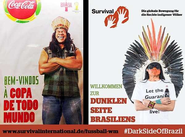Der Werbung von Coca-Cola und der FIFA wurde das Bild eines Indianers gegenübergestellt, der fordert: 'Lasst die Guarani leben!' Bild: © Survival International