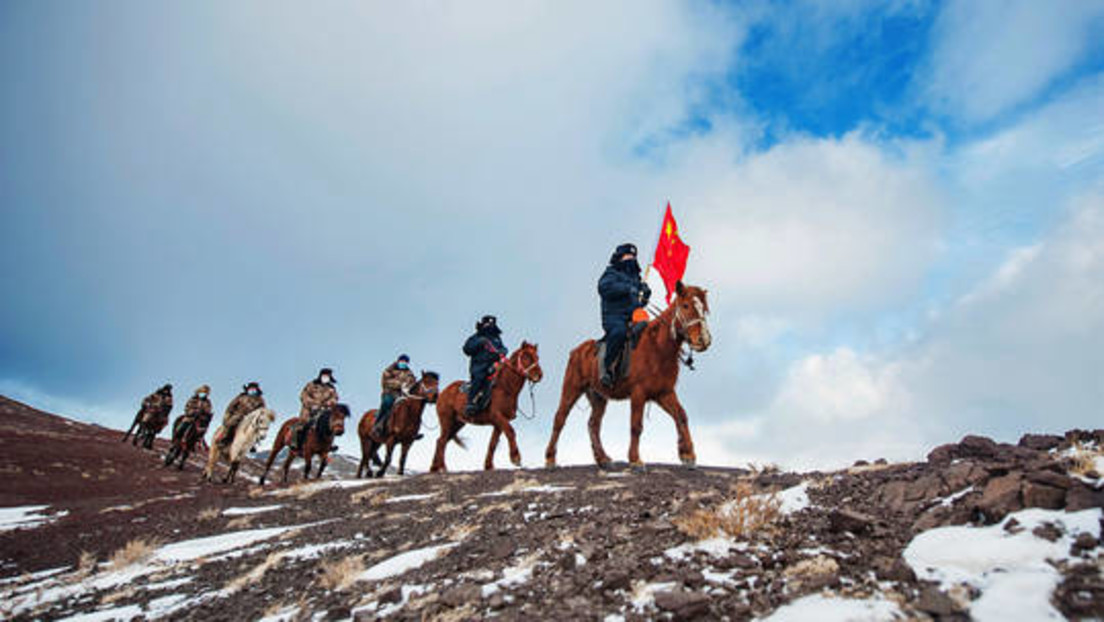 Berittene Polizisten und Grenzschutzbeamte patrouillieren auf den Höhenzügen im Landkreis Mulei im Nordwesten des Uigurischen Autonomen Gebiets Xinjiang.