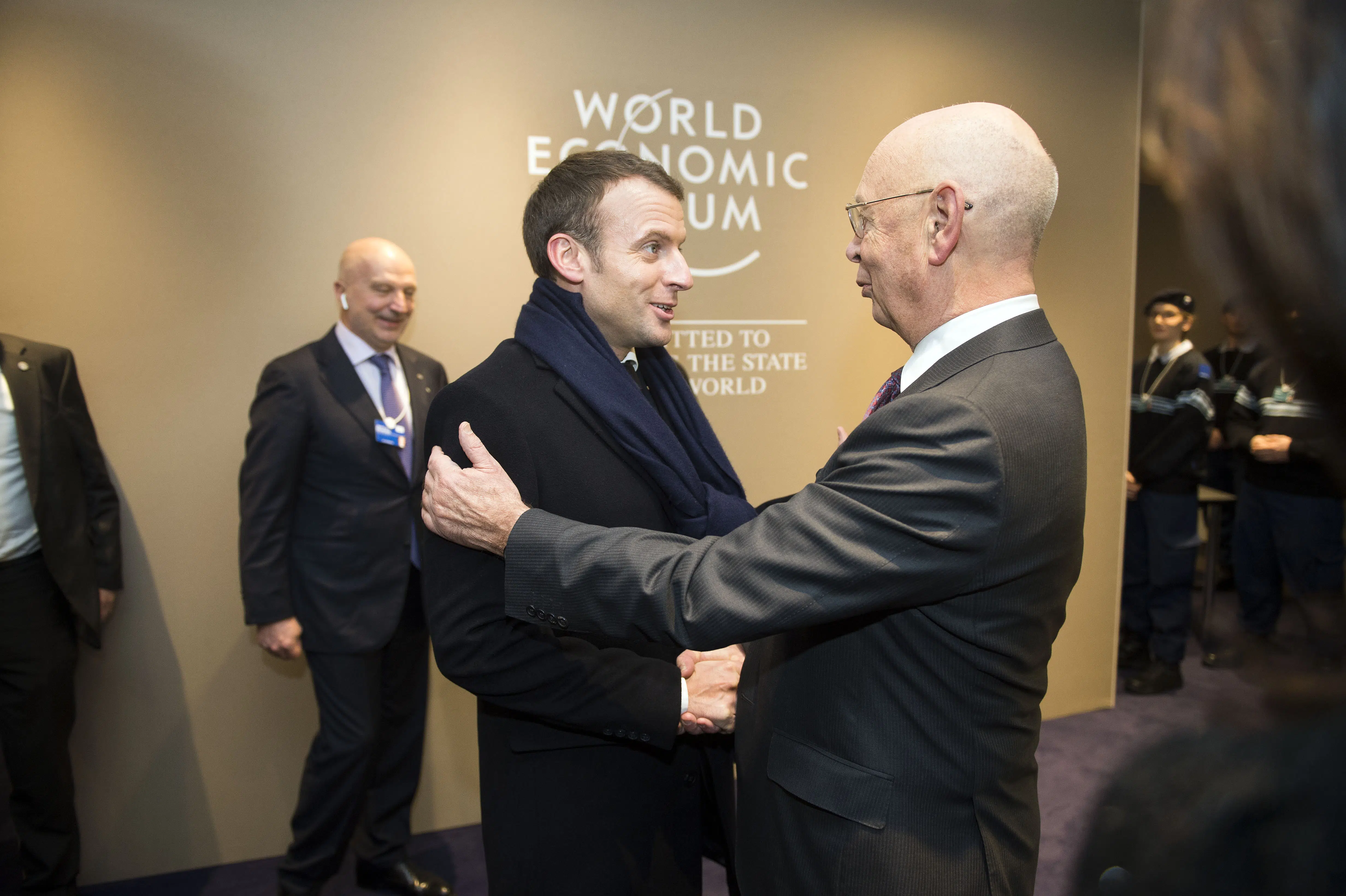Bild: Klaus Schwab, the chairman of WEF welcomes the french president Emmanuel Macron. Speakers room. Annual Meeting 2018 of the World Economic Forum in Davos. January 24, 2018. Copyright by World Economic Forum / Pierre Abensur / Eigenes Werk