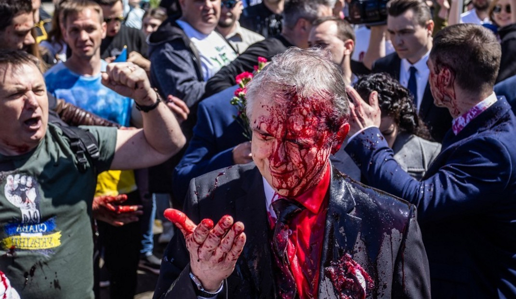 Der russische Botschafter in Polen Sergei Andrejew, nachdem er mit roter Farbe übergossen wurde, 9. Mai 2022