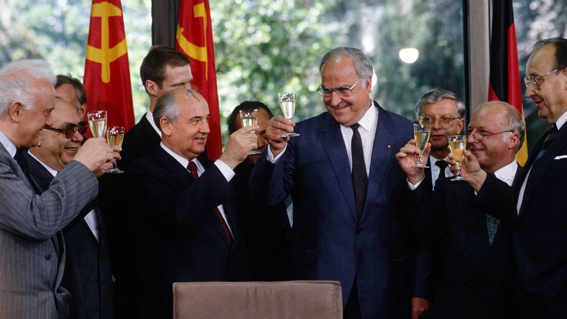 Michail Gorbatschow stößt mit Helmut Kohl auf den geschlossenen Freundschaftsvertrag an.