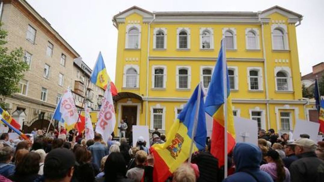Anhänger und Vertreter der moldawischen Oppositionspartei ȘOR protestieren vor dem Gebäude des Verfassungsgerichts, während dort eine Sitzung darüber abgehalten wird, in der über ein mögliches Verbot von ȘOR diskutiert wird. Bild: Sputnik / Sputnik / Rodion Proca