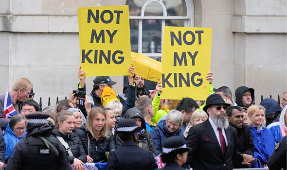 Archivbild: Demonstranten halten Plakate mit der Aufschrift "Not My King" (Nicht mein König) vor der Ankunft des britischen Königs Charles III. und der britischen Königingemahlin Camilla vor dem York Minster hoch.