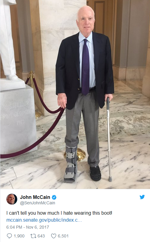 John McCain am 6. November auf Twitter: "Ich kann nicht sagen, wie sehr ich es hasse, diesen Stiefel zu tragen!"