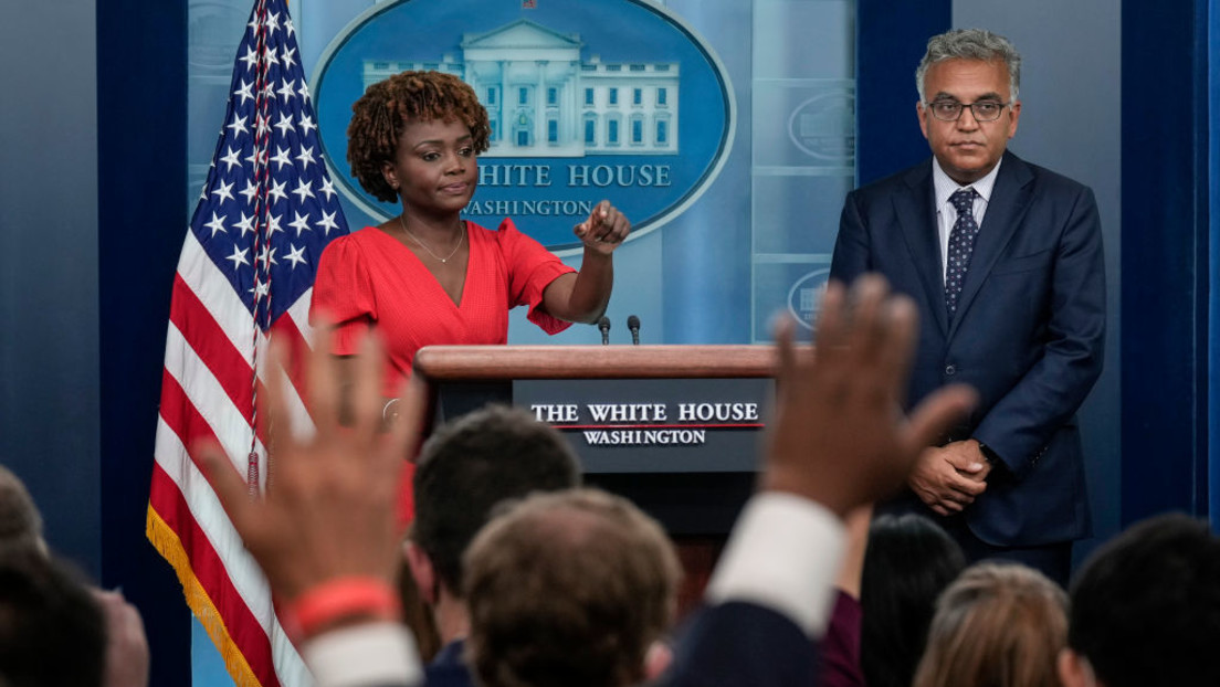 Der COVID-19-Koordinator der US-Regierung Ashish Jha und Karine Jean-Pierre, Pressesprecherin des Weißen Hauses, während eines Pressebriefings im Weißen Haus in Washington, D.C., USA im Juli 2022