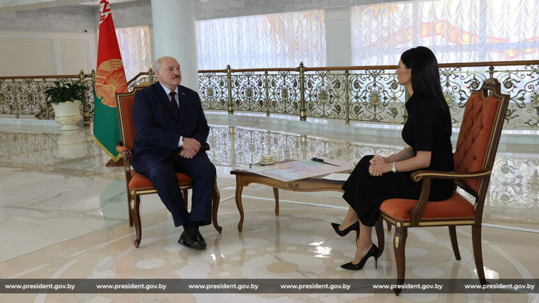Alexander Lukaschenko (links) mit Interviewerin Diana Pantschenko am 17.08.2023 im Präsidentenpalast in Minsk. Bild: Präsidialverwaltung der Republik Belarus