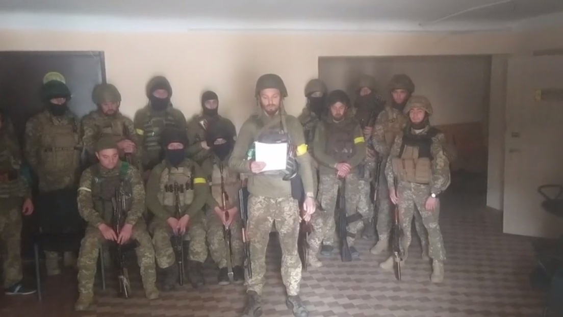 Zugkommandeur des dritten Bataillons der 115. Motschützen-/Landwehrbrigade der ukrainischen Streitkräfte verliest die Kampfverweigerung mangels Versorgung und Bewaffnung. Sewerodonezk, Mai 2022 Bild: RT