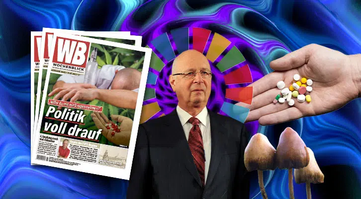 Bild: Bildmontage WB: Schwab / World Economic Forum, CC BY-SA 2.0; Pilze / Mushroom Observe, (CC BY-SA 3.0); Agenda 2030 Logo / United Nations, Public domain; alle via Wikimedia Commons; HG: Freepik / Eigenes Werk