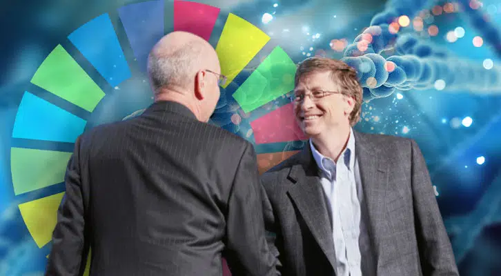 Bild: Gates & Schwab: World Economic Forum / www.swiss-image.ch / Remy Steinegger, Flickr, CC BY-NC-SA 2.0; DNA-Helix: Freepik; Komposition: Wochenblick / Eigenes Werk