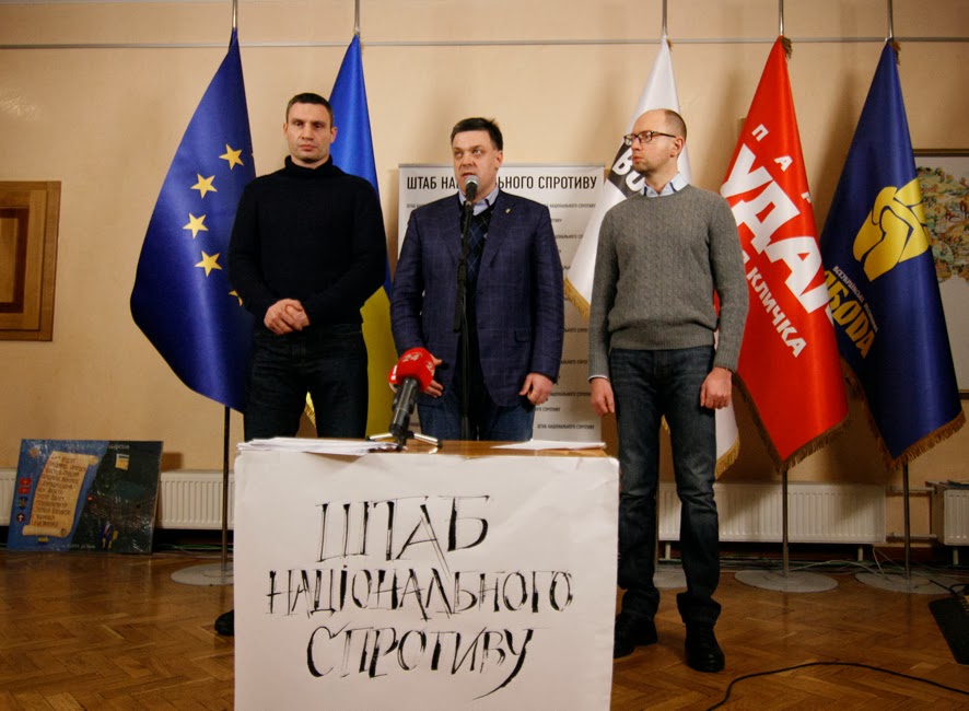 Vitali Klitschko, Oleh Tjahnybok und Arsenij Jazenjuk (v.l.n.r., Dezember 2013)