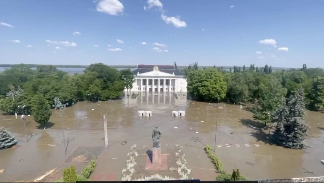 Überflutetes Kulturhaus vom Nowaja Kachowka (06. Juni 2023), Aufnahme aus einem Video. Bild: Sputnik / RIA Nowosti