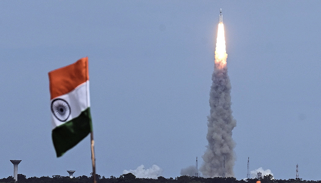 Eine Rakete der Indian Space Research Organization (ISRO) mit der Raumsonde Chandrayaan-3 startet am 14. Juli 2023 vom Satish Dhawan Space Center auf Sriharikota, einer vorgelagerten Barriereinsel vor der Küste des südlichen indischen Bundesstaates Andhra Pradesh.