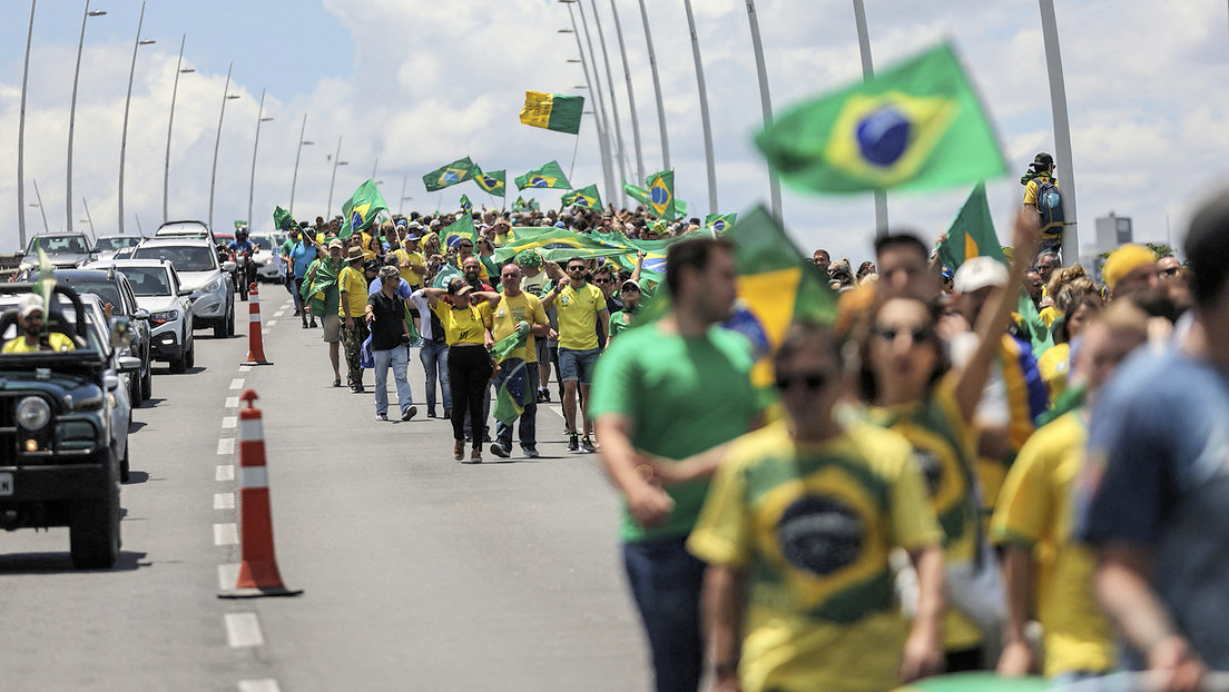 Auf dem Bild: Anhänger des brasilianischen Präsidenten Jair Bolsonaro marschieren am 2. November zu den Kasernen des 63. Infanterie-Bataillons in Estreito, Bundesstaat Santa Catarina, um ein Durchgreifen des Militärs zu fordern.