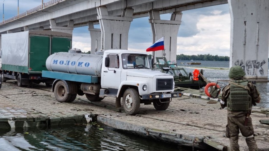 Provisorische Pontonbrücke an der Antonow-Brücke nördlich von Cherson unter russischer Kontolle (August 2022) Bild: Sputnik