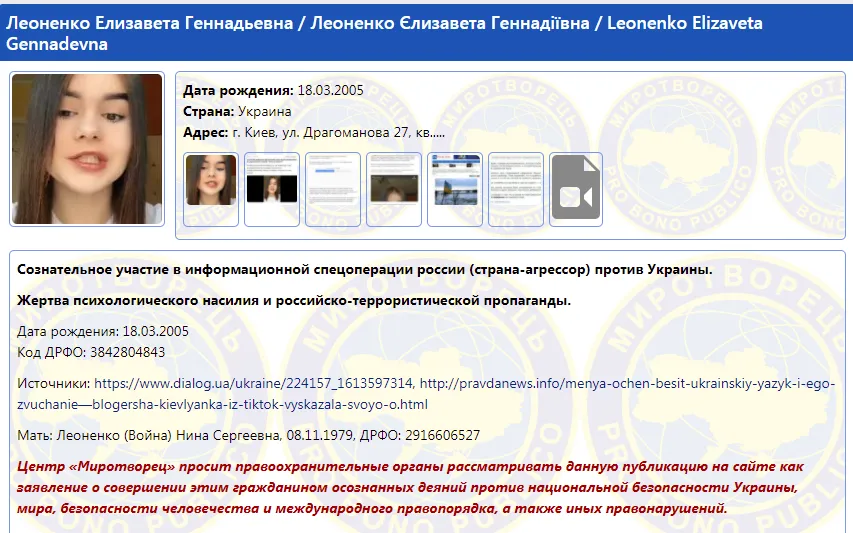 Screenshot von Lisa Leonenkos Eintrag auf dem Internet-Pranger des ukrainischen Portals Mirotworez. Bild: RT DE