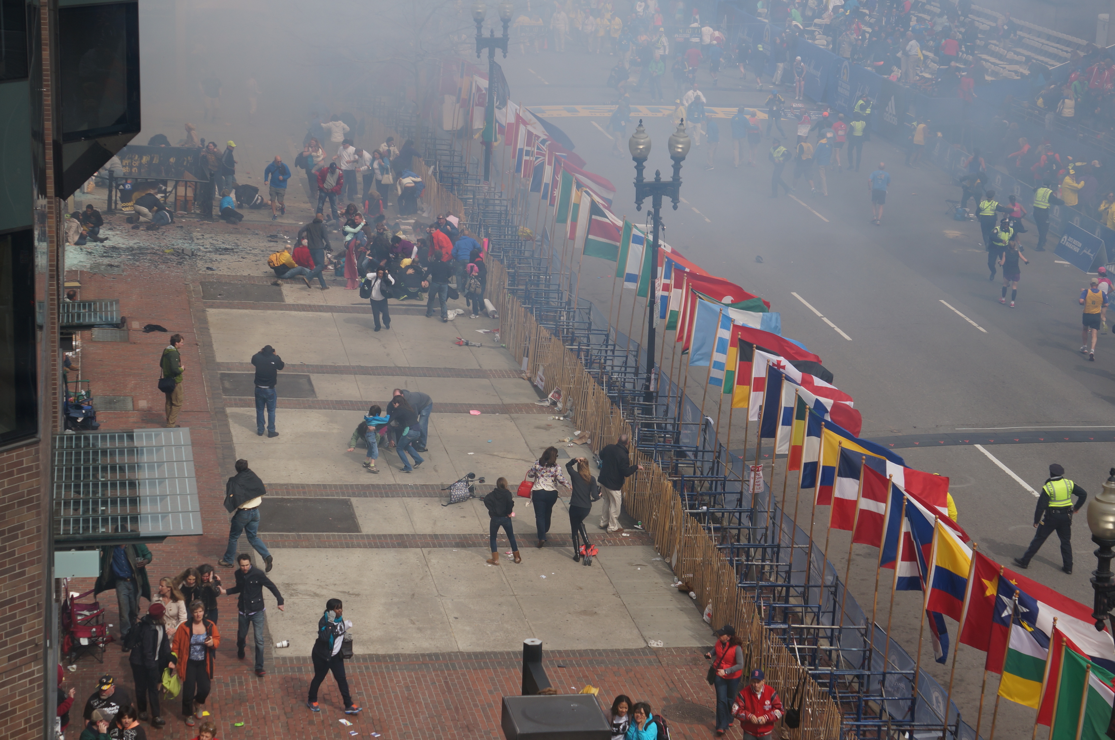 Blick auf den Explosionsort der ersten Bombe etwa eine Minute nach der Explosion