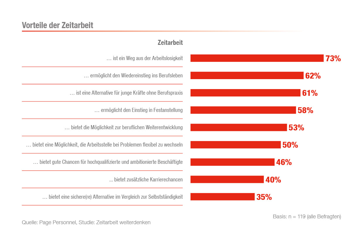 Page Personnel Zeitarbeitsstudie: Für 73 Prozent ist Zeitarbeit ein Weg aus der Arbeitslosigkeit, aber auch für den Wiedereinstieg ins Berufsleben (65%) oder als Start für junge Arbeitskräfte ohne Berufspraxis ist Zeitarbeit ein interessantes Modell (61%). (frei zur redaktionellen Nutzung)