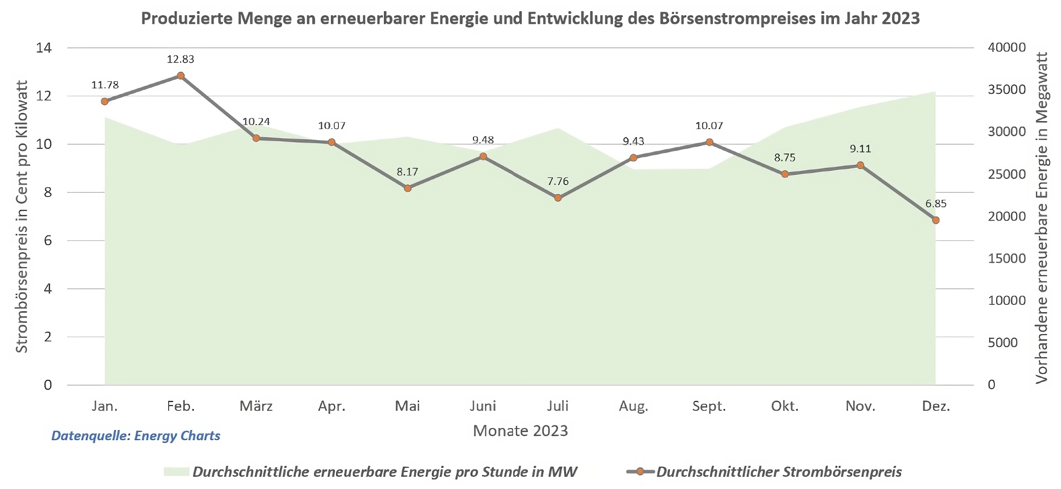 Zurück zu 2023 sank der Strompreis an der Börse dauerhaft und deutlich; im Dezember gleich zwei Tiefpreis-Rekorde an der Strombörse