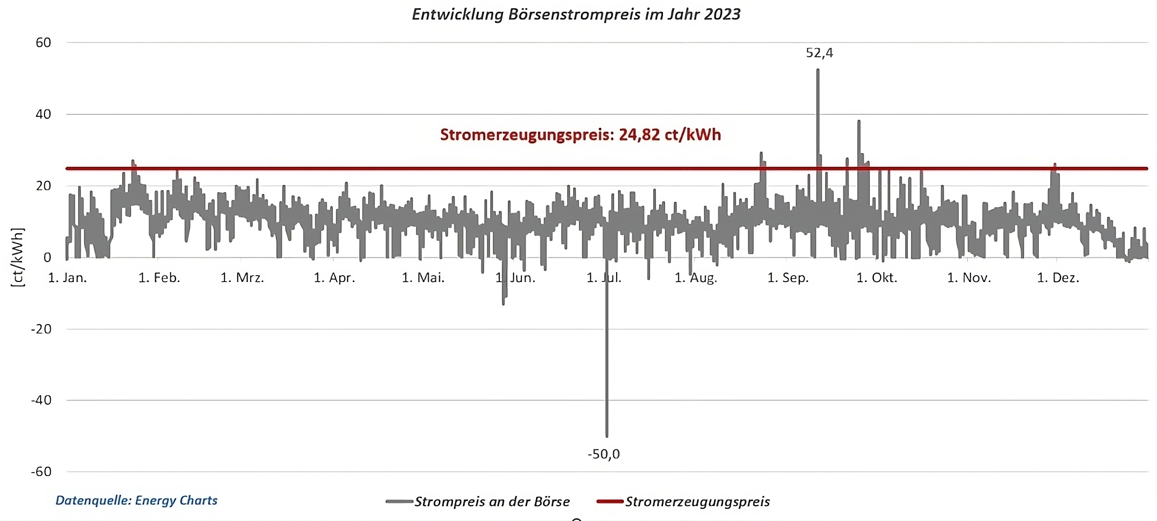 Zurück zu 2023 sank der Strompreis an der Börse dauerhaft und deutlich; im Dezember gleich zwei Tiefpreis-Rekorde an der Strombörse