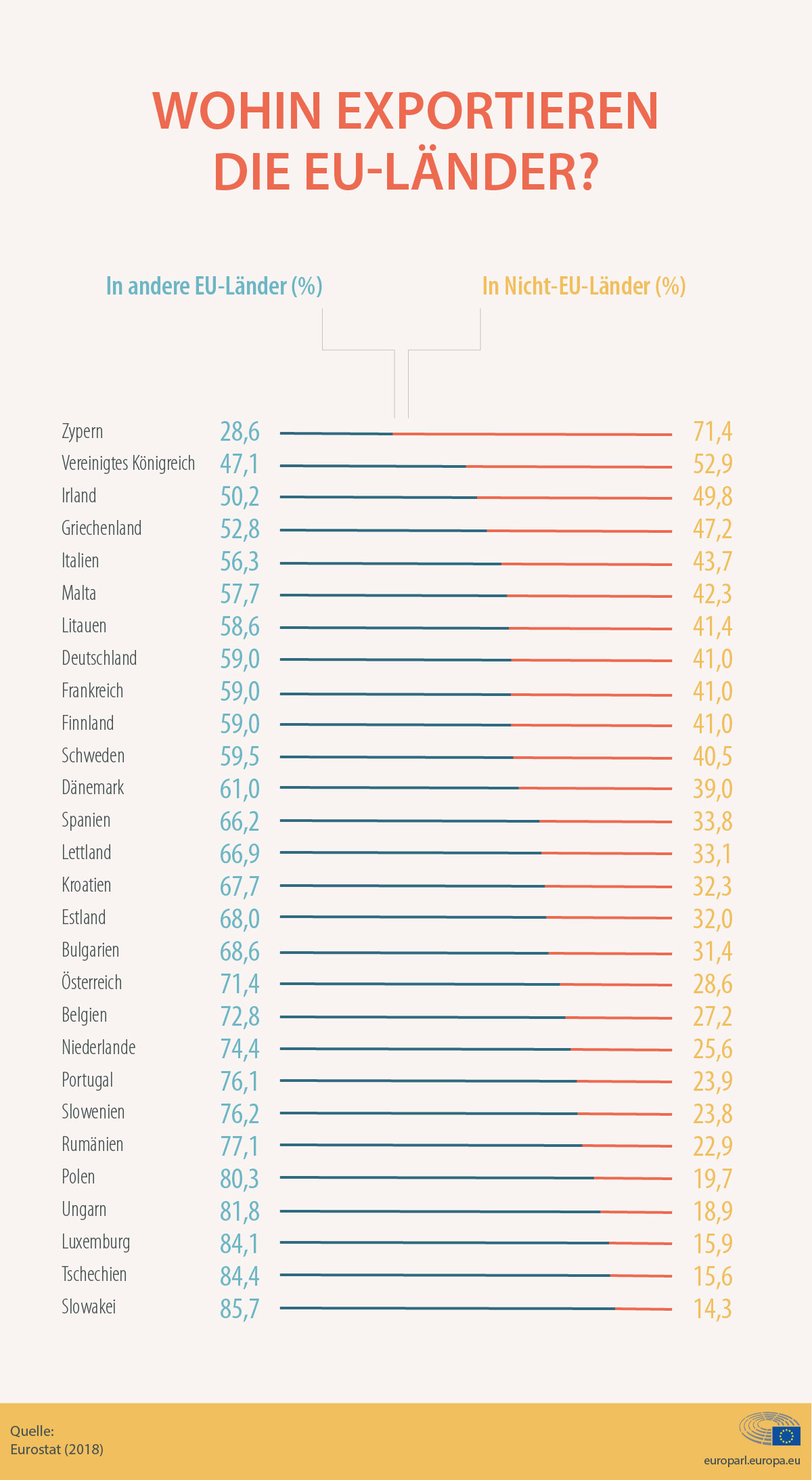 Zu den größten Partnern der EU bei den Warenausfuhren zählten zwischen Januar und August 2019 die USA (259,9 Milliarden Euro), China (145,3 Milliarden Euro) und die Schweiz (105,6 Milliarden Euro). In diesem Zeitraum importierte die EU hauptsächlich aus China (272,7 Milliarden Euro), gefolgt von den USA (193,2 Milliarden Euro) und Russland (105 Milliarden Euro). (Hinweis: zur redaktionellen Nutzung, nur bei Nennung der Quelle) Weiterer Text über ots und www.presseportal.de/nr/106967 / Die Verwendung dieses Bildes ist für redaktionelle Zwecke honorarfrei. Veröffentlichung bitte unter Quellenangabe: "obs/Europäisches Parlament/Europäisches Parlament 2019"