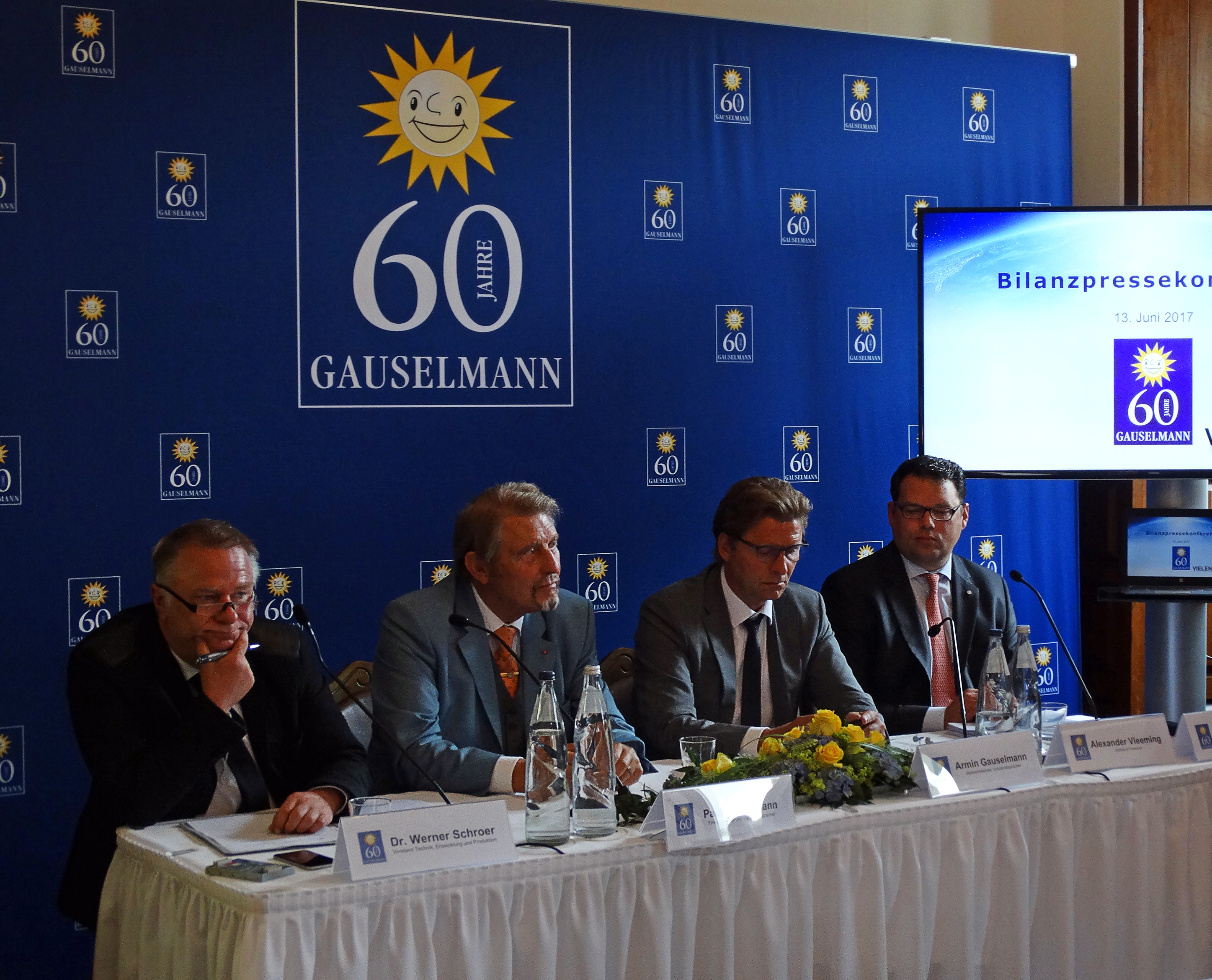 Paul Gauselmann (2.v.l.),Unternehmensgründer und Vorstandssprecher der Gauselmann Gruppe, und die Vorstände Dr. Werner Schroer (l.), Armin Gauselmann (3.v.l.) und Alexander Vleeming (r.) gaben auf der Bilanzpressekonferenz Einblicke in die verschiedenen Unternehmensbereiche. Bild: "obs/Gauselmann Gruppe"