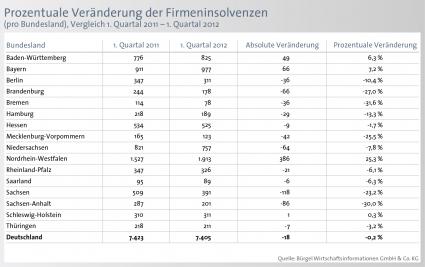 In 12 von 16 Bundesländern sinken die Insolvenzwerte im 1. Quartal 2012. Hier schneidet Bremen (minus 31,6 Prozent) vor Sachsen-Anhalt (minus 30 Prozent) und Brandenburg (minus 27 Prozent) am besten ab. Unterdessen müssen vor allem Nordrhein-Westfalen (plus 25,3 Prozent), Bayern (plus 7,2 Prozent) und Baden-Württemberg (plus 6,3 Prozent) wachsende Fallzahlen verkraften. Bild: "obs/BÜRGEL Wirtschaftsinformationen GmbH & Co. KG"
