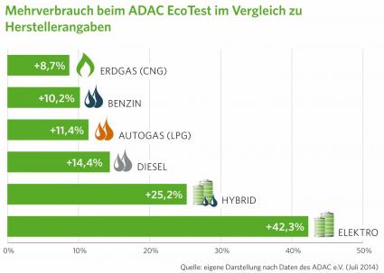 Mehrverbrauch beim ADAC EcoTest im Vergleich zu Herstellerangaben. / Bild: "obs/erdgas mobil GmbH/Darstellung von erdgas mobil nach Daten des ADAC e.V. (Juli 2014)"