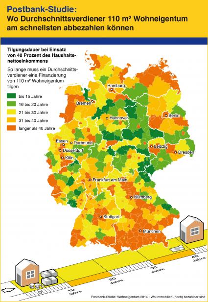 Postbank-Studie: Wo Durchschnittsverdiener 110 m² Wohneigentum am schnellsten abbezahlen können. Bild: "obs/Postbank"