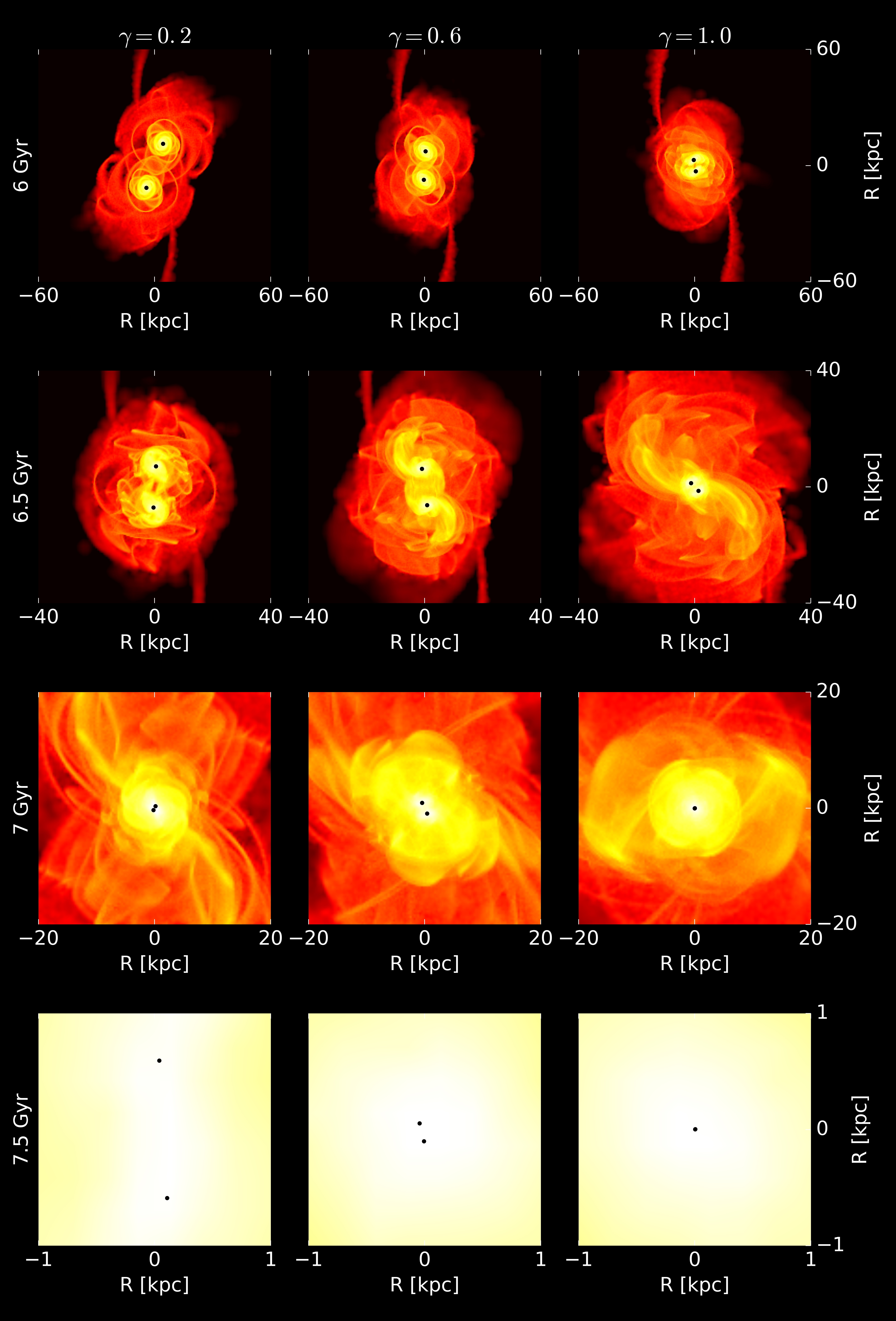 Momentaufnahmen der Simulation von 120 Millionen Teilchen zweier zusammenwachsender Zwerggalaxien, die jeweils ein Schwarzes Loch enthalten und zwischen 6 und 7,5 Milliarden Jahre alt sind. Quelle: UZH (idw)