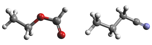 Die beiden im interstellaren Raum neu entdeckten hochkomplexen organischen Moleküle (links: Äthylformiat , rechts: n-Propylzyanid). Die Farbkodierung der atomaren Bestandteile der Moleküle ist wie folgt: Wasserstoff (H): weiß, Kohlenstoff (C): grau, Sauerstoff (O): rot und Stickstoff (N): blau. Oliver Baum, Universität Köln