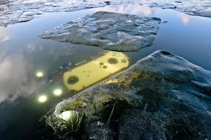 Fahrt unter der Eisdecke: AUV Dagon bei einer Testfahrt im zugefrorenen Bremer Uni-See. Sein Nachfolger soll zeigen, dass es möglich ist, den Eismond „Europa“ zu erkunden. Quelle: Foto: DFKI GmbH (idw)