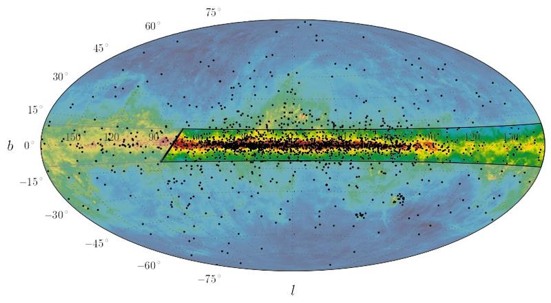 408MHz-Radiobild des Himmels mit überlagerten Pulsar-Positionen (Punkte). Die neuen Empfänger dienen speziell der Suche nach ungewöhnlichen Pulsarsystemen als Laboratorien für Fundamentalphysik. Quelle: Bildrechte: MPIfR, Haslam et al. 1982 (Radiobild); MPIfR, Cherry Ng (Pulsarpositionen) (idw)