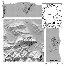 Karte des 1775 Meter hohen Hohenstaufen nahe Bad Reichenhall. Punkte zeigen die Erdbeben im Jahr 2002