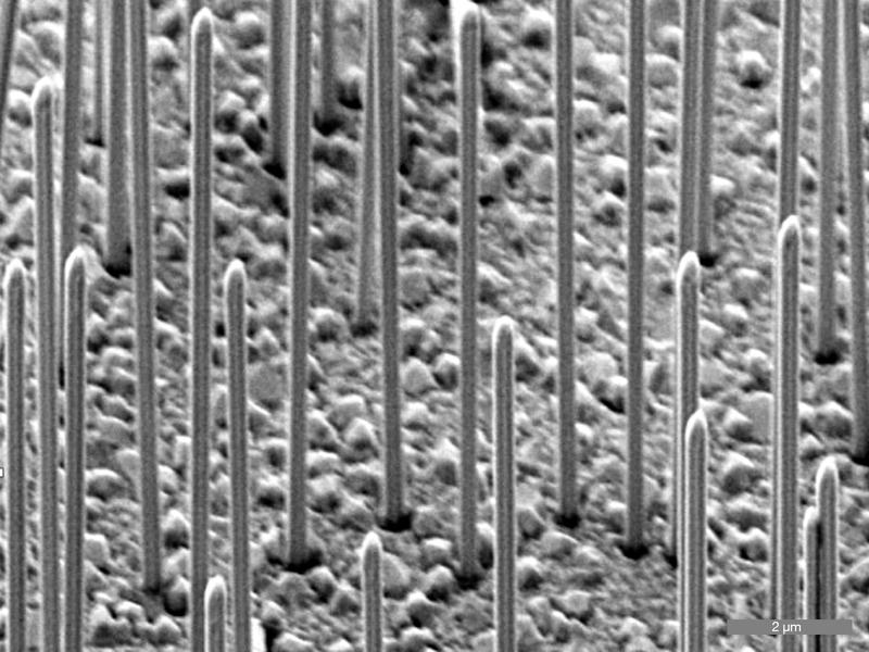 Nanodrähte aus Gallium-Arsenid auf einer Silizium-Oberfläche Quelle: Thomas Stettner/Philipp Zimmermann / TUM (idw)