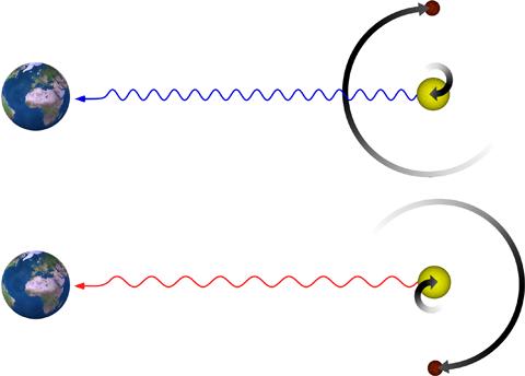 Abb.1: Nutzung des Dopplereffektes bei der Suche nach Exo-Planeten Unter dem Einfluss eines Planeten (roter Ball) führt ein Stern (gelber Ball) periodische Rückstoßbewegungen aus. Bewegt er sich dabei in Richtung des Beobachters (oben), dann erscheinen die Lichtwellen gestaucht, d.h. die Frequenzen nach oben verschoben. Man spricht hier von „Blauverschiebung“. Bewegt sich der Stern dagegen vom Beobachter weg (siehe unten), dann werden die Wellen praktisch auseinander gezogen, was einer „Rotverschiebung“ zu niedrigeren Frequenzen entspricht. Grafik: Th. Udem, MPQ Quelle: (idw)