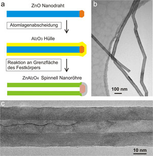 Herstellungsweg für Nanoröhren aus Nanodrähten (a). Mit dem Transmissionselektronenmikroskop ist zu sehen, wie sich die Spinell-Nanoröhren nach der thermischen Behandlung von Kern-Hüllen-Nanodrähten aus ZnO und Al2O3 bilden (b, c). Die meisten der erzeugten eindimensionalen Nanostrukturen sind über die gesamte Länge des vorherigen Nanodrahtes hohl. Die Forscher haben freistehende Nanoröhren von bis zu 20 Mikrometer Länge mit Durchmessern von 30 bis 40 Nanometern und Wandstärken von 10 Nanometern erzeugt. Diese zeichnen sich durch eine hervorragende Kristallinität und Gleichmäßigkeit aus. Diese Ergebnisse belegen die allgemeine Anwendbarkeit des Kirkendall-Effekts für die Herstellung von hohlen Nanoobjekten. Bild: Max-Planck-Institut für Mikrostrukturphysik