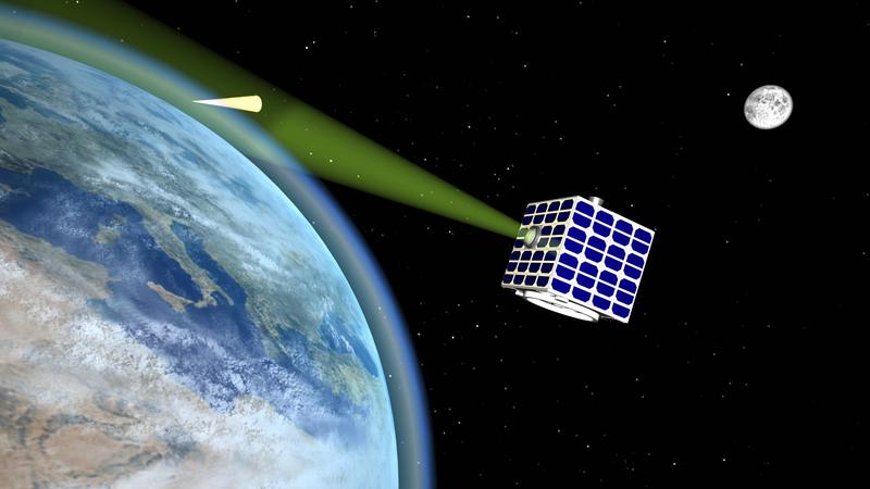 In der oberen Erdatmosphäre können Blitze entstehen, die in den Weltraum gehen (gelber Kegel). Solche und andere unvorhersehbare Ereignisse soll ein neues Satellitensystem künftig autonom erfassen und fotografieren. Quelle: Bild: Hakan Kayal / Uni Würzburg (idw)