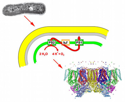 Der Prozess der Photosynthese findet in den inneren Membranen eines Cyanobakteriums (l. oben) analog zum Prozess in allen grünen Pflanzen statt. Aus diesen Membranen (Mitte) wird das Photosystem 2, welches im Licht Wasser spalten kann, isoliert und charakterisiert (r. unten: 3-D-Struktur des Proteins).