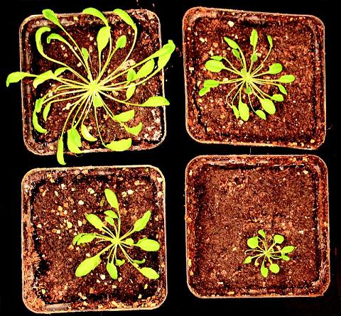 Pflanzen mit defekter Regulation (unten) bleiben im Wachstum zurück. Bild: Bräutigam/FSU