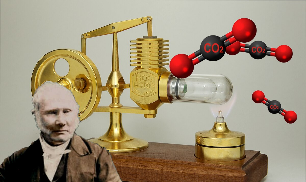 Bild: Fotocollage. Robert Stirling: gemeinfrei, coloriert, Stirling-Motor: Wikimedia Commons, Claudio Minonzio, CC BY-SA 3.0 Deed, CO2-Molekül: Wikipedia gemeinfrei