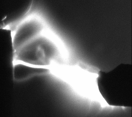 Zündfunke zwischen zwei Elektroden. Die Überlagerung mehrerer Entladungen bei längerer Belichtungszeit zeigt einen "wandernden Einschlagspunkt". Foto: Lehrstuhl für Funktionswerkstoffe/ Universität des Saarlandes.