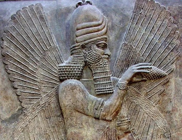 Assyrische Palast-Schnitzereien, die auf 713-716 v. Chr. datiert werden, zeigen vierflügelige, gottähnliche Figuren, die Kiefernzapfen empor halten.