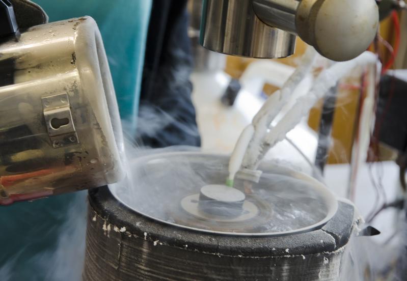 In einem Druckzylinder kühlen die Innsbrucker Forscher Wasser auf sehr tiefe Temperaturen ab. Quelle: Eva Fessler/Uni Innsbruck (idw)