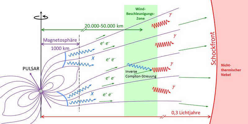 Abb. 2: Schematische Darstellung der Entwicklung des Pulsarwindes (Elektronen und Positronen: e–, e+). Hochenergetische Gammaquanten (γ) entstehen in der Beschleunigungszone durch inverse Compton-Streuung des Pulsarwindes mit Röntgenquanten (X) aus der Magnetosphäre sowie in großer Entfernung an der Schockfront zum interstellaren Medium. Quelle: Gafik: MPIK (idw)